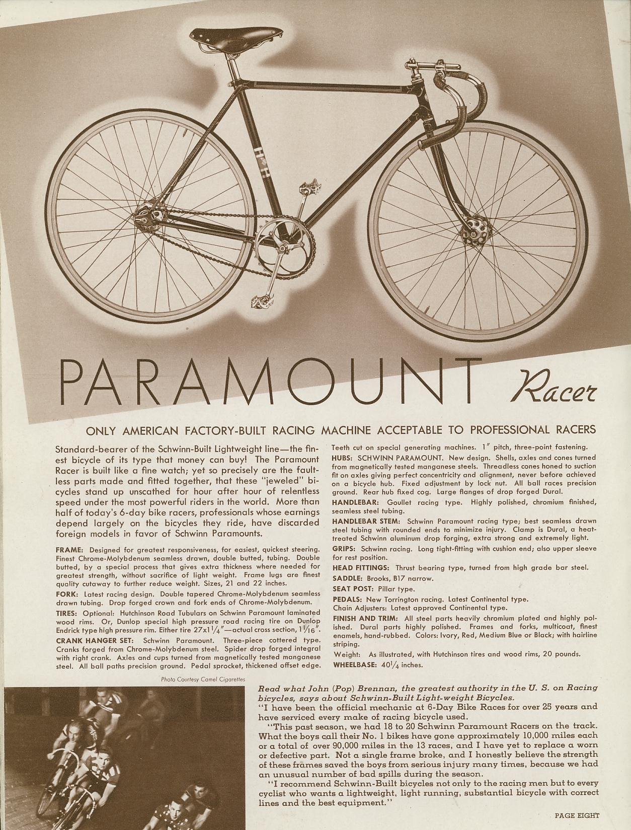 “Read what John (Pop) Brennan, the greatest authority in the U. S. on Racing bicycles, says about Schwinn-Built Light-weight Bicycles.