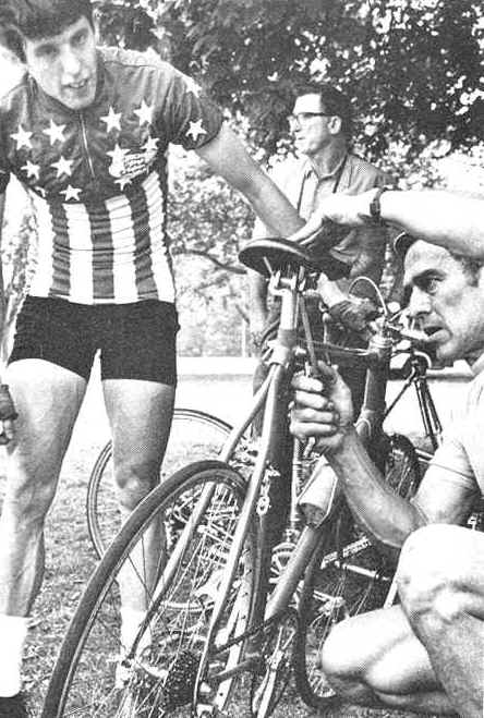 Photo on left of Harlan Meyers making adjustments to a Hi-E Cosmopolitan aluminum bike. That’s Steve Dayton of Indianapolis/ Speedway Wheelmen, wearing his 1971 Senior Road champion jersey.