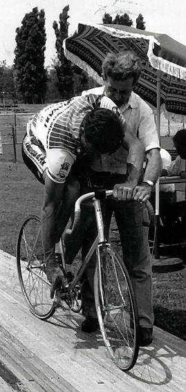 Pino holding rider beginning test of his complete bike with Dr. Conconi. Velodrome E.U.R. Roma