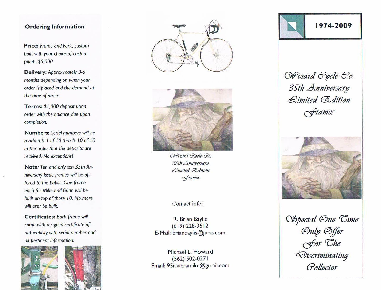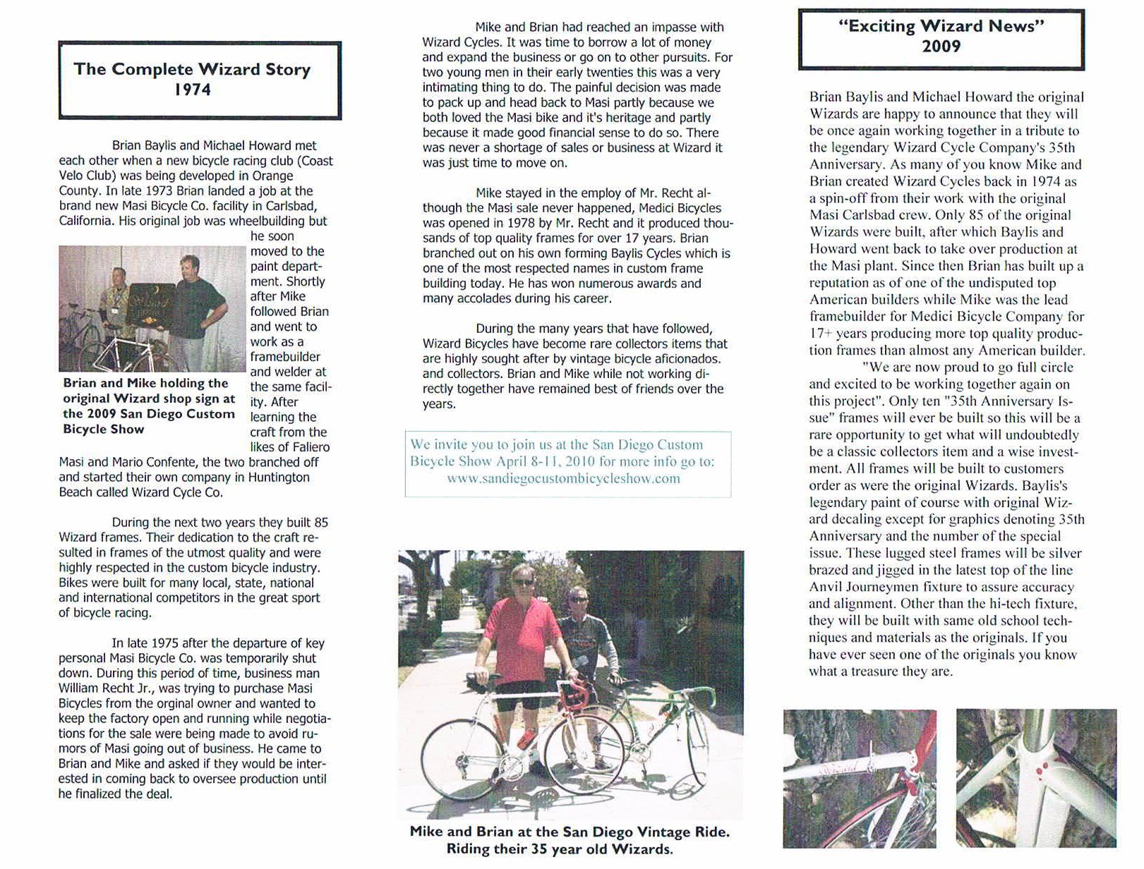 Born in southern California by ex-Masi staffers Mike Howard and Brian Baylis. Only a relatively few frames were made by this duo before Mike moved onto Medici and Brian to his namesake models. A special “reunion” batch of frames were made later by the two craftsmen, circa 2009. Sadly Brian passed away in Feb of 2016.